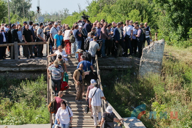 Киев с самого начала обсуждения вопроса срывал согласование разработанного Международным Комитетом Красного Креста (МККК) проекта восстановления моста, требуя, чтобы ширина его пролета не позволяла осуществить пропуск по сооружению бронетехники. ЛНР неоднократно подчеркивала абсурдность требований украинской стороны, указывая на то, что предлагаемые Республикой характеристики подлежащего восстановлению участка моста - ширина три метра и нагрузочная способность в пять тонн - никоим образом не могут обеспечить движение по сооружению военной техники, однако являются минимальными для нормальной работы экипажей машин скорой помощи. Необходимость проезда санитарных автомобилей обусловлена большим количеством случаев ухудшения самочувствия людей, вынужденных по несколько часов находиться в очередях; регулярно фиксируются летальные исходы.