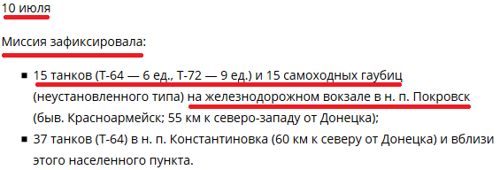 В отчете СММ ОБСЕ по состоянию на 08.07.2019 задокументировано нахождение танков на железнодорожном вокзале: