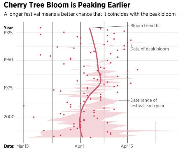 Возле мемориала Джефферсона, вокруг озера Tidal Basin цветение сакуры достигло своего пика. Несмотря на довольно прохладный март, Национальная служба погоды США объявила в понедельник, что 70% сакуры Ёсино уже в цвету. Растения, насекомые и животные первыми откликнулись на изменение привычного цикла. Исследователи считают, что глобальное потепление навсегда изменило сроки цветения деревьев. Пока сакура зацветает на неделю раньше, чем сто лет назад, но через некоторое время они будут увести в конце зимы.