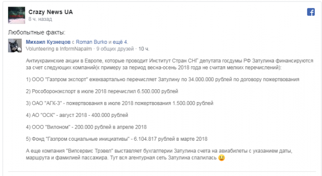 Антиукраинские акции в Европе, которые проводит Институт Стран СНГ депутата госдумы РФ Константина Затулина финансируются за счет следующих компаний(к примеру за период весна-осень 2018 года не считая мелких перечислений):
