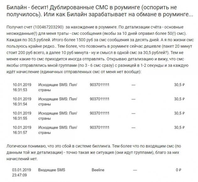 Именно так решил поступить один из авторов на популярном форуме в Интернете. По словам мужчины, на протяжении 17 лет он и вся его семья пользовалась услугами Билайна. Расклад изменила последняя поездка автора публикации. В январе месяце он находился в другом регионе страны, где его номер попал в роуминг. За это время у него на счете появился крупный минус, он ушел в минус на 1,5 тысячи рублей. При детализации счета выяснилось, что 50 SMS, находясь в роуминге каждое сообщение ему стоило 30,5 рублей.