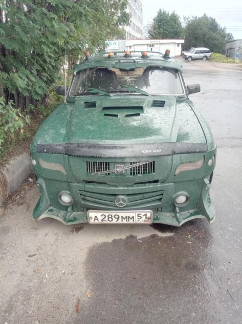 Владелец автомобиля оснастил её устрашающим обвесом, включившим в себя огромное количество элементов, позаимствованных у иномарок. Например спереди можно обнаружить целых две решетки радиатора – от Mercedes и Volvo – причём одна из них даже оснащена рабочими противотуманными фарами. Капот получил несколько воздуходувов различной формы, а на головной оптике появились пластиковые накладки с причудливым вырезом.