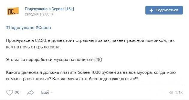 Так, в частности, в местном сообществе «Подслушано в Серове» жительница города сегодня сообщила, что ночью ощутила резкий запах, открыв с вечера окна. «…в доме стоит страшный запах, пахнет ужасной помойкой…», - жалуется женщина. При этом она недоумевает, почему вынуждена платить коммунальщикам несметные цены за вывоз мусора, если помойка всё равно фактически у неё дома.