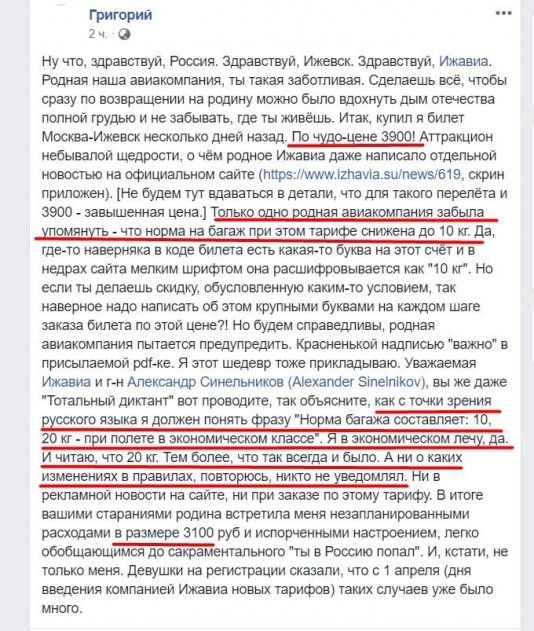 По словам обманутого пассажира, «Ижавиа» намеренно умолчала об этом в рекламной новости на сайте и не уведомила клиентов при совершении покупки. Вероятно, таким образом авиакомпания, прикрываясь якобы сниженными тарифами, решила нажиться на доверчивых клиентах за счёт доплат за «лишние килограммы», о которых те узнали лишь возле стойки регистрации.