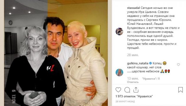Садальский в Instagram высказал слова соболезнования этому горю семьи: «Сегодня ночью во сне умерла Ира Цывина. Совсем недавно у себя на страницах она прощалась с Сергеем Юрским, Юлей Началовой, Лешей Булдаковым, а вот теперь не стало и ее – скорбная весенняя очередь пополнилась еще одной душой. Господи, прими ее с миром. Царствие тебе небесное, прости и прощай».