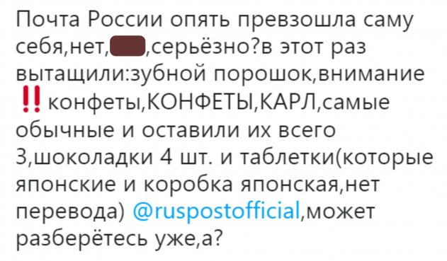 Клиентка Почты России призывает руководство компании разобраться с воровством из посылок. На сей раз, получив почтовое отправление, клиентка не досчиталась конфет в посылке. Эмоционально, с использованием ненормативной лексики, девушка выражает негодование на страничке в соц.сети.