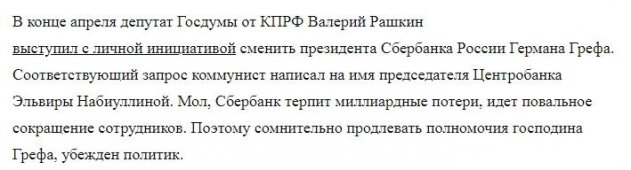Герман Греф является главой «Сбербанка» уже достаточно долгое время – с 2007 года. 24 мая 2019 года состоится заседание акционеров, на котором они решат, останется ли Герман во главе организации или же все-таки ему придется искать замену. Дело сомнительное, так как в конце апреля нынешнего года депутат Госдумы от КПРФ Валерий Рашкин выступил с личной инициативой сменить президента Сбербанка России Германа Грефа. По его мнению, организация терпит огромные убытки и стоит явно сменить руководство, на что Центробанк заявил, мол, решаться это все будет на общем собрании, если только сам Греф, по своету того же Рашкина, не подаст в отставку.