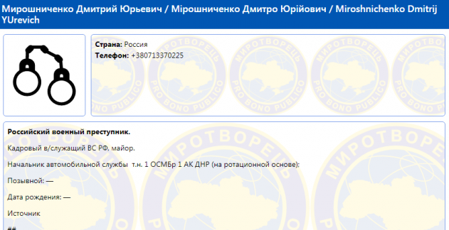 Информация из базы данных «Миротворец» проливает свет на то, какой именно «бизнес» был у Мирошниченко. Он – военный преступник, кадровый военнослужащий ВС РФ, майор. Подвизался как начальник автомобильной службы т.н. 1 ОСМБр 1 АК ДНР (на ротационной основе).