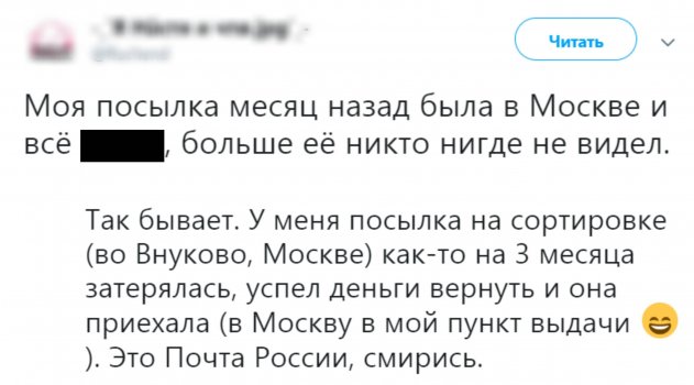 «Это Почта России, смирись» - даже прождав три месяца, россияне не растеряли ироничного настроения. Однако не все клиенты настроены к компании настолько добродушно. Есть и те, кто на собственном опыте решил убедиться, как именно Почта России скрывает тайну долгой доставки посылок.