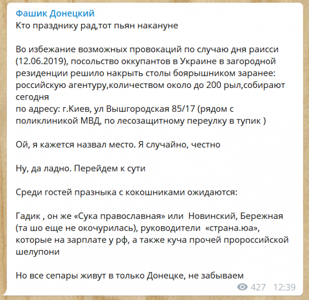 По данным блогера с ником Фашик Донецкий, сегодня в Киеве запланировано проведение празднования дня России (отмечается 12 июня). По информации источника, на закрытое мероприятие приглашены около 200 человек, среди которых многие известные пророссийские деятели и политики.