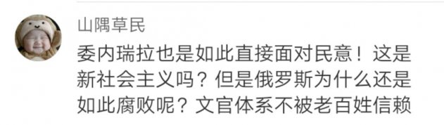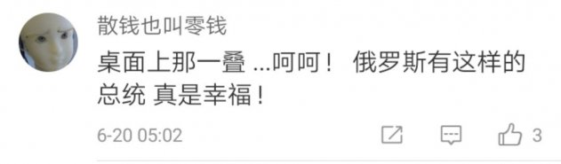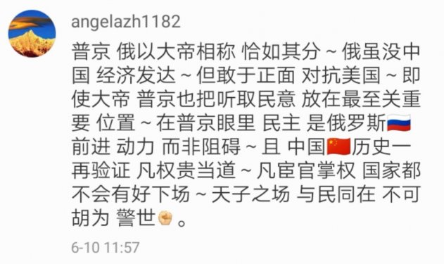 1. angelazh1182:«Путин у власти — как раз то, что нужно России. Несмотря на то, что российская экономика не такая развитая, как китайская, страна все равно не боится противостоять Соединенным Штатам. Путин, как великий государь, прислушивается к мнению народа и придает ему важное значение. Он видит в нем движущую силу России, которая не знает преград. На протяжении веков Китай неоднократно сталкивался с узурпацией власти олигархами, когда такое происходит, страна обречена. Подобный эфир показывает, что „император" и народ действуют осмысленно. Это и привлекает внимание».