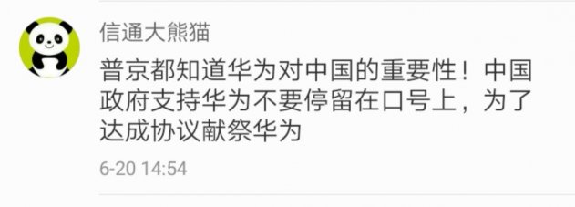 6. Общительная панда: «Путин понимает, как важна „Хуавэй" для Китая! Китайское правительство поддерживает компанию и не должно ограничиваться только словами и приносить в жертву „Хуавэй", чтобы достичь соглашения».
