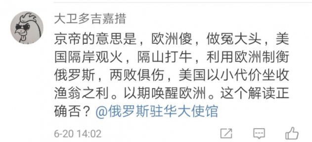 7. Давэй Доцзицзяцо: «Смысл фразы Путина такой: Европе не хватает ума, и она действует недальновидно. Америка остается безучастной и покупает кота в мешке, пытаясь за счет Европы обуздать Россию, обе стороны оказываются в проигрыше. Она старается выждать нужный момент, не затрачивая при этом больших усилий, и расшевелить Европу. Разве не так?»
