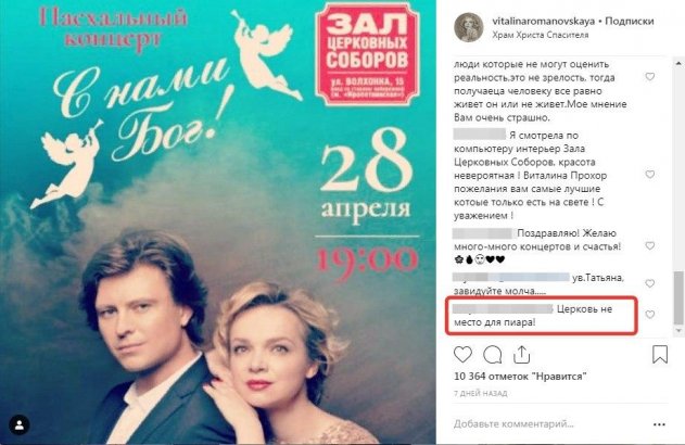 На днях экс супруга Армена Джигарханяна Виталина Цымбалюк-Романовская на своей странице в Instagram прорекламировала предстоящий концерт. Оказывается, они с Прохором Шаляпиным в день празднования Пасхи решили провести концерт в храме Христа Спасителя.