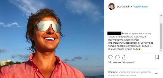 Однако привыкшие к тому, что звезды достаточно часто и много грешат фотошопом, скептически настроенные подписчики Шаляпина не поверили в его идеальную улыбку и отметили, что ранее на одной из фотографий у него была белой только половина зубов. «Внимательнее нужно быть» - пишут в Сети то ли с иронией, то ли с искренним желанием помочь пока не в совершенстве владеющим фотошопом Прохору.
