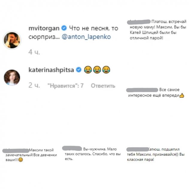 Но подписчики догадались, что любвеобильный Виторган страдал не так и долго и уже нашёл достойную замену Ксении. На своей официальной странице в Instagram он опубликовал шуточное видео, под которым оставила неоднозначный комментарий его коллега, Екатерина Шпица, известная по фильмам «Ёлки». На первый взгляд кажется, что актриса просто оценила шутку Максима, но фанаты уверены, что за скромной перепиской скрывается бурный роман и Виторган явно «подцепил» молодую красотку. Тем более, Екатерина также сама воспитывает сына и любит фильмы в стиле артхауз. Поклонники напрямую заявили под постом: «Платон, принимай новую маму!».
