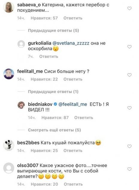 «А куда деньги скидывать, чтобы накормить Варнаву?», «Обожаю Катерину, но косточки выперли, как при анорексии. Уж очень худенькая стала», «Хоть анатомию изучай», - переживают за Катю поклонники.