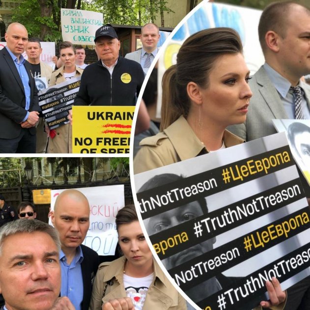 Журналистка Ольга Скабеева засветилась на акции в поддержку Вышинского. Украинский журналист угодил в тюрьму 15 мая 2018 года. Задержали Кирилла Вышинского в Украине якобы за государственную измену и поддержку ДНР и ЛНР. Эти «преступления» нашли в его рабочей деятельности. Посольство Украины в Москве собрало у своих дверей десятки людей, среди которых «журналистская элита» РФ – Ольга Скабеева и Дмитрий Киселев.