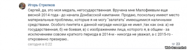 На своей странице в соцсети «Вконтакте» Игорь Гиркин подтвердил: «Да, это моя медаль, негосударственная. Вручена мне Малофеевым (предпринимателем, основателем «Фонда святителя Василия Великого» Константином Малофеевым – ред.) ещё весной 2014 года – до начала Донбасской кампании. Продаю, поскольку имеют место материальные проблемы, которые я не могу «залатать» имеющимися наличными средствами», – написал Гиркин в комментариях на своей странице.