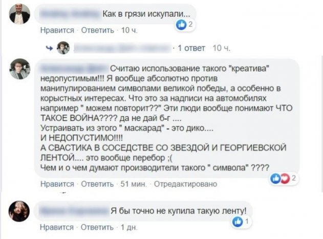 Мнение пожаловавшегося на скандальную георгиевскую ленту новгородца разделили и другие пользователи на просторах сети, которые признались, что их «будто в грязи искупали». Другие признались, что никогда не купили бы такую ленту, а третьи заявили, что желают авторам «никогда больше не быть дизайнерами».