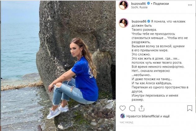 «Я поняла, что человек должен бать твоего размера. Чтобы тебе не приходилось становиться менше… Чтобы его не раздражать, вызывая волну за волной, цунами в его привычном мире….Это как жить в доме. где… хм…потолок чуть ниже твоего роста. Всё время немного некомфортно…», — такой отрывок взяла знаменитость для описания, видимо, тех чувств, которые сейчас «терзают» Бузову.