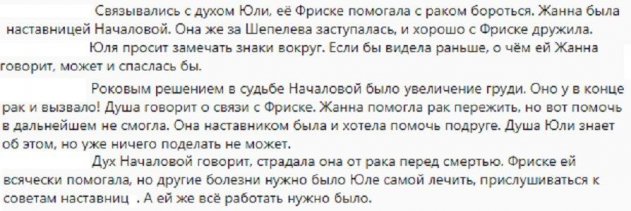 Экстрасенс также заявляет, что хоть умирающая в последние месяцы жизни от онкологии Началова и просила помощи у Жанны, но было уже поздно. Обнаруженный на ранних стадиях рак отступил, но дали о себе дать другие болезни, которые и решили судьбу Юлии. Фриске якобы помогла перебороть онкологию, но повлиять на дальнейшую судьбу не смогла, заявляет эксперт.