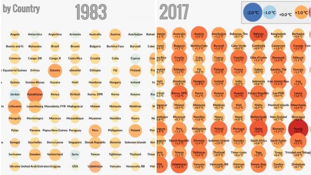 Среди стран, которые были названы экспертами, наиболее отличились в 90-е годы Эстония, Литва, Латвия, Швеция, Норвегия, Польша. Температура сразу после 1990 года в этих странах поднялась сразу на 1,5 градуса. После 1995 года к ним присоединились Россия, Испания, Казахстан, Монголия, где температура возросла уже более, чем на два градуса. К 2010 году температурные аномалии стали заметны уже в Канаде, Узбекистане, а также Кипре, Турции и Египте.