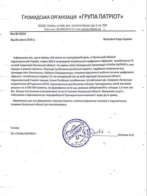 На подконтрольной части Луганской области с 4 апреля и по сей день отсутствует телевизионный сигнал украинских каналов, в результате чего, телезрителям доступны лишь программы российских пропагандистов. Об этом в обращении к Верховной Раде Украины сообщает Общественная организация «Группа Патриот», по информации которой, данная ситуация сложилась по причине отключения от электроэнергии шести телевышек в Луганской области предприятием «Луганское энергетическое объединение», подконтрольным проживающему ныне в Украине российскому олигарху Константину Григоришину.