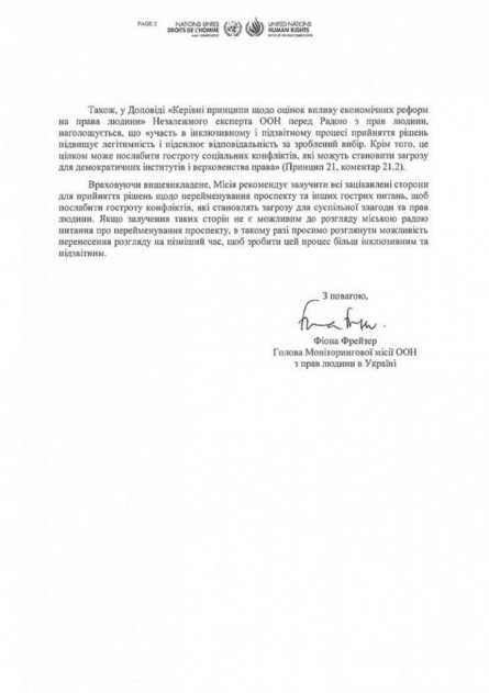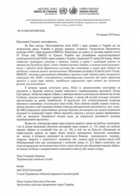 Об этом говорится в письме главы Мониторинговой миссии ООН по правам человека в Украине Фионы Фрейзер мэру Харькова Геннадию Кернесу, председателю Харьковской ОГА Юлии Светличной и заместителю министра иностранных дел в Украине Сергею Кислице от 18 июня, сообщает Depo.Харьков.