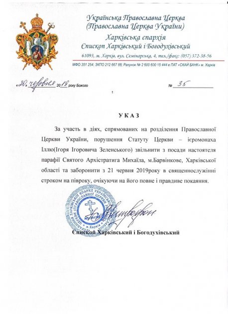 Согласно церковным указам, насельнику Свято-Феодосийского мужского монастыря Киева Андрею запрет введен на три месяца, а настоятелю прихода в Барвенково Харьковской области Илье — на полгода. Иеромонаха Илью также сняли с должности настоятеля прихода.