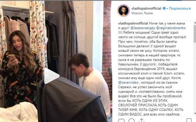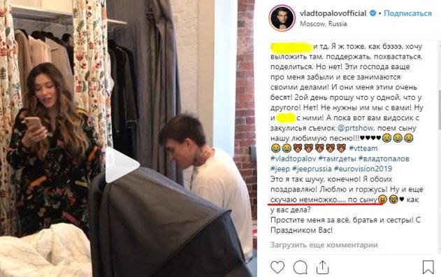 Похоже, что обида у Влада Топалова на Тодоренко все же есть: он в коне своего гневного поста указал, что скучает и любит исключительно сына, а о жене слова не было сказано. С Сергеем Лазаревым дела обстоят несколько иначе: несмотря на обвинения, Топалов занимался одновременно подхалимажем, поскольку даже успел назвать друга победителем Евровидения-2019.