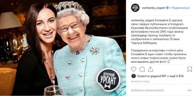 Недавно ведущий и юморист Иван Ургант в Instagram-микроблоге своего телешоу «Вечерний Ургант» показал фотографию, на которой при помощи фотошопа объединил снимки 33-летней Ольги Бузовой и 92-летней королевы Великобритании Елизаветы II. Именно таим образом Ургант прокомментировал новость о том, что монарх впервые разместила пот в соцсети. Однако, по мнению Ивана, чтобы собрать много «лайков», королеве нужно было сфотографироваться со звездой Instagram Ольгой Бузовой.