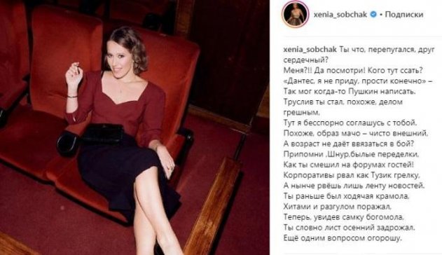 Как оказалось, в первый раз Собчак вызвала рокера на битву после защиты Дарьи Мороз. Однако, Шнуров, ссылаясь на старость и страх увязаться в драку с нынешним любовником Ксении Константином Богомоловым отказался от встречи в стихотворной форме. Стоит отметить, ответ Собчак дала незамедлительно, опубликовав очередную «поэму» в соцсети. «Ты раньше был ходячая крамола, Хитами и разгулом поражал, Теперь, увидев самку богомола, Ты словно лист осенний задрожал», — пишет Ксения. Более того, Собчак не только открыто унизила Шнурова, намекнув на профнепригодность и отсутствие мужского достоинства, но и настоятельно посоветовала рокеру принять участие в скандальных шоу Андрея Малахова, в случае продолжения конфликта.