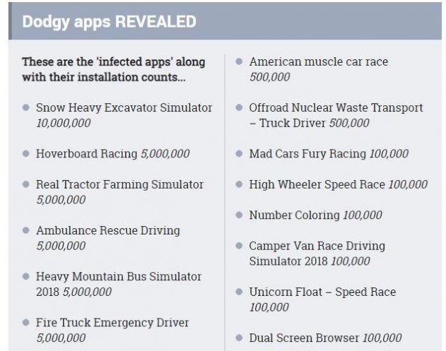 Были обнаружены сотни зараженных рекламных приложений на Google Play Store, которые трудно обнаружить. Издательство «The Sun» называет некоторые из опасных приложений – Snow Heavy Excavator Simulator, Hoverboard Racing, Real Tractor Farming Simulator, Ambulance Rescue Driving, Heavy Mountain Bus Simulator, Fire Truck Emergency Driver, Car Parking Challenge, Hot Micro Racers, Water Surfing Car Stunt, Wingsuit Simulator и многие другие.