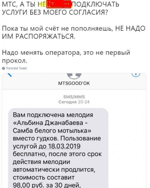 В социальной сети появился пост от одной из клиенток МТС, которая пожаловалась на то, что оператор без согласия клиентов, принудительно подключает платные мелодии Джанабаевой на гудок. МТС не дает возможности выбрать клиенту, хочет он ее к себе вместо гудков или нет - она подключается автоматически, и поначалу является бесплатной. Но самое интересное, что в сообщении с информацией о подключении нет никакого упоминания о том, как ее выключить до того момента, пока не начнут списывать средства со счета.