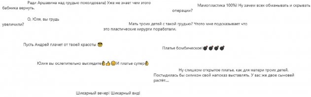 Учитывая троих детей, в соцсетях подозревают Юлию в увеличении груди и маммопластике, то есть коррекции бюста. Некоторые фанаты и вовсе считают, мол Барановская увеличила грудь для Аршавина.
