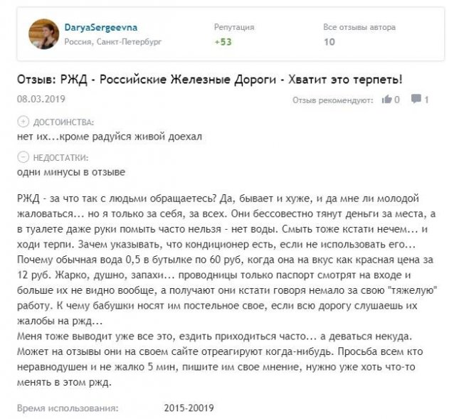 В отзыве на одном из популярных порталов пассажирка рассказала о своём негативном опыте использования услуг РЖД на примере поездок в пределах своего региона. Говоря о достоинствах компании, девушка отметила, что их нет, написав в соответствующей графе «радуйся живой доехал». При этом недостатков в обслуживании РЖД хоть отбавляй.