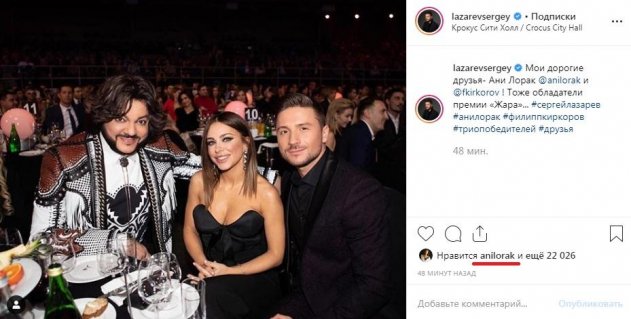 Недавно состоялась музыкальная премия «Жара», на которую Лорак и Лазарев пришли вместе и всю церемонию не отходили друг от друга. При этом в Instagram Сергей подписал, что находится в компании друзей.