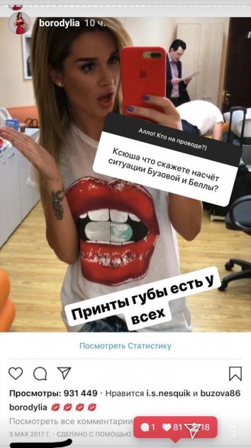 Бородина не осталась в стороне и на вопрос фанатов, что она думает по этому поводу, ответила: «Принты губы есть у всех». Это означает, что в споре Ксюша не поддерживает свою коллегу, а стала на сторону ее оппонентки. Интересно, как на это отреагирует сама Бузова, и предъявит ли она что-то теперь самой телеведущей.