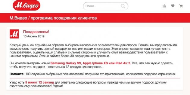 В российском сегменте сети «Интернет» мошенническая схема с предложением заработать на опросах онлайн уже давно известна и мало кто на неё покупается. В то же время люди всё ещё доверительно относятся к известным брендам, чем и пользуются аферисты. Так сеть поразило новое «кидалово» с использованием популярного бренда «М.Видео».