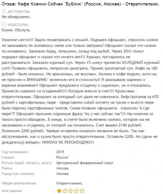 Первая рецензия, которой сеть реагирует на запрос «отзывы о кафе Собчак», озаглавлена словом «Отвратительно». Посетитель недоволен практически всем: «тугим» персоналом, из-за медлительно скорости которого якобы приходится есть холодную пищу, качеством еды и высокими ценами.