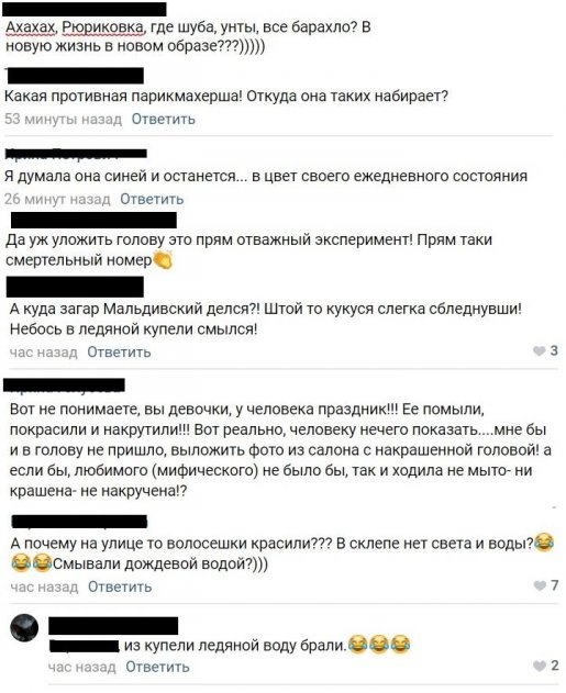 Хейтеры в фан-группах сразу стали обсуждать новую внешность звезды. Примечательно, что мало кто нашел поход к парикмахеру важным событием. Особенно удивил тот факт, что все процедуры осуществлялись вне дома на открытом воздухе. Люди даже пошутили, что голову Анастасия мыла в ледяной купели.