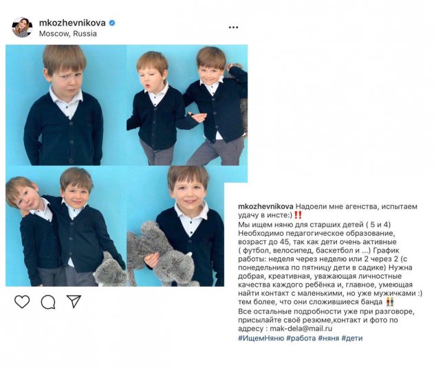 Мария Кожевникова объявила в своем профиле, что ищет няню для своих сыновей, притом не через агентства, а с помощью Instagram. Видимо, предыдущие претенденты совсем разочаровали экс-звезду «Универа» и девушка решила найти работниц на просторах интернета.
