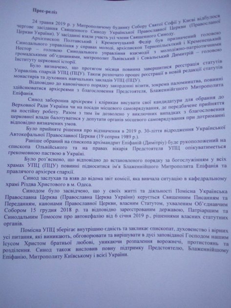 Опубликован полный текст решения Священного Синода Украинской Православной Церкви, который состоялся сегодня, 24 мая в Киеве.