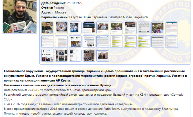 Так, до списку ворогів України Михайло Галустян потрапив через те, що він був у Криму після анексії, підтримує президента РФ Володимира Путіна і є учасником військово-патріотичному руху.