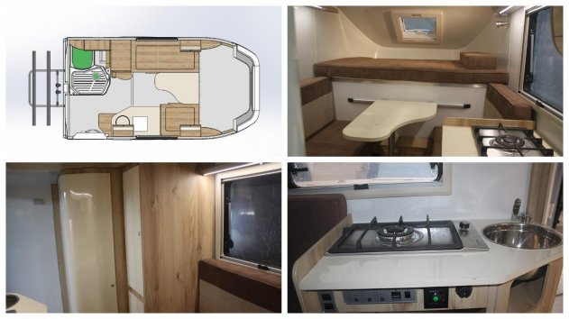 Новинка адаптирована как для непродолжительных, так и для долгих автопутешествий и содержит все, что необходимо для комфорта: двуспальный «диван», миниатюрную кухню с плитой на 1 конфорку и мойкой, санитарную зону с кассетным био-туалетом и душем. Дом на колесах также оборудуется баком для чистой воды емкостью 70 л, баком для сточных вод емкостью 45 л, 5-литровым газовым баллоном для приготовления пищи и обогрева в случае необходимости. Также имеются шкафчики для вещей, продуктов и принадлежностей.