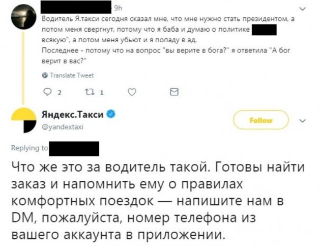 Далее шофер нёс чрезвычайно странные предположения о будущем девушки. Он якобы предрек ей место президента, с которого ее свергнут, ведь она женщина. Но на этом ужас не закончился. По словам водителя «Яндекс.Такси», несостоявшееся «протеже Путина» убьют из-за политики, а дальше ее ждут адские муки.
