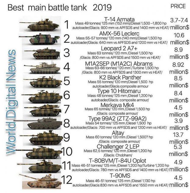 Недавно сеть взбудоражил рейтинг основных боевых танков мира, выложенный инстаграм аккаунтом Worlddigitalnews. Не смотря на очевидное первое место новой платформы «Армата», а точнее танка Т-14 на её базе, многие места этого рейтинга вызывают вопросы.