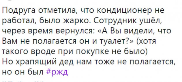 Слова проводника можно было трактовать как пожелание: «Терпите и задыхайтесь». Пассажирка добавила, что храпящий по соседству дедушка также не был упомянут в числе комплекта услуг РЖД, а он, тем не менее, присутствовал. Женщина предположила, что по своим надобностям ей придётся выбегать на редких 5-минутных остановках и то – за отдельную плату.