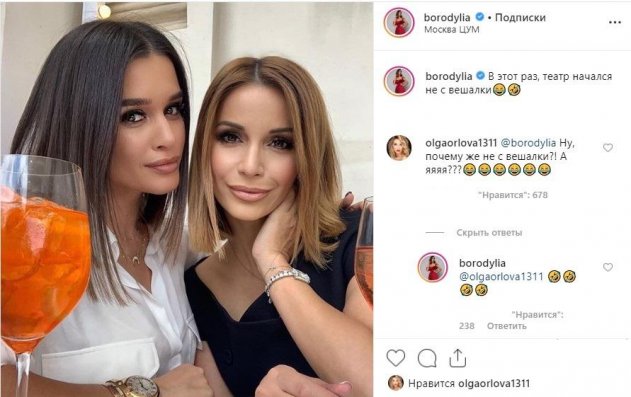 После совместного похода в театр с Ольгой Ксени отшутилась в Instagram: «В этот раз, театр начался не с вешалки». Хотя удивляет не это, а то, насколько похожи стали две подружки друг на друга. В глаза сразу бросается, что Орлова копирует Бородину в её повадках, стиле и даже в макияже. Конечно, уже давно говорили о лицемерных целях Ольги увести мужа Ксении Омарова Курбана из семьи, но тут дело, видимо, не только в счастливой семье Бородиной. Став внешне второй Ксюшей, Орлова точно может «украсть» рабочее место звезды на ТНТ.
